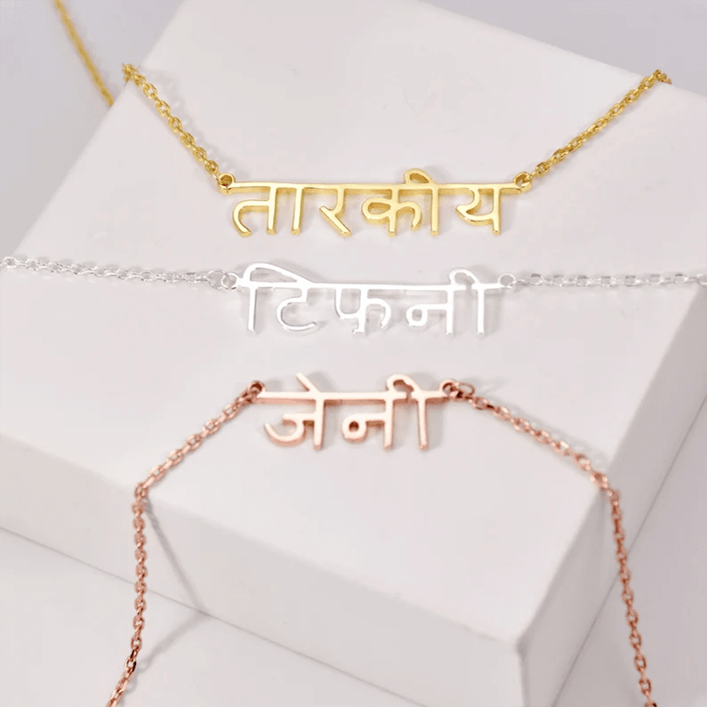 Explore our exquisite name necklace in Hindi, crafted with precision and elegance. This personalized piece is made from high-quality materials and perfect for showcasing your cultural pride or gifting to a loved one. Shop now for fast delivery and unbeatable prices!